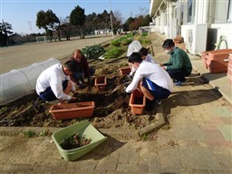 B組生徒が校舎前の花壇を使い、野菜作りを行っています。今回は、大根やニンジン、カブなど冬にとれる野菜を調べ、たねや苗から育てています。今日は、久しぶりの晴れ間を使い、草取りなどの作業を行っていました。