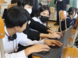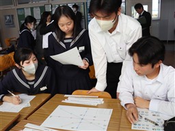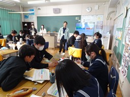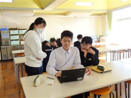 2年生は英文を考えて相手に伝える学習をゲームと絡めて楽しく取り組んでいました。英文をたくさん作ろうと、知っている単語をたくさん使って英文を作る生徒や、逆に、同じ単語をいろいろなパターンで使う生徒など、工夫して学習に取り組んでいました。