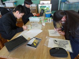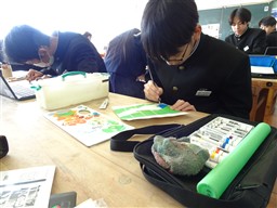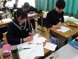 2年生が美術の学習で、ジグザグトリックアートに挑戦しています。思い思いの下絵をもとに、表と裏で絵が変わる作品を集中して制作しています。