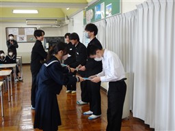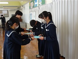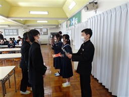12月に生徒会本部が行った赤い羽根共同募金(5540円)を社会福祉協議会にお渡ししました。