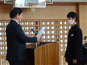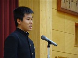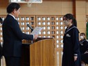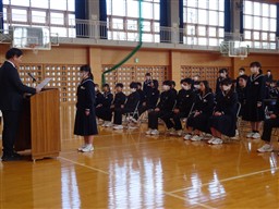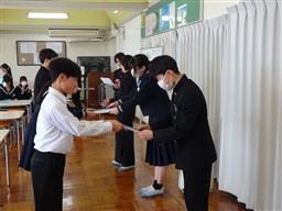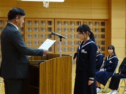 放課後、表彰夕礼を行いました。今回は、「地区児童生徒理科論文審査」「地区社会科研究論文」「地区読書感想文コンクール」で優秀な成績を収めた生徒を表彰しました。また、地区英語弁論大会出場者と、市明るい選挙啓発ポスターコンクール、人権啓発ポスターコンテストの入賞者の紹介を行いました。