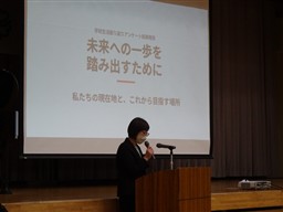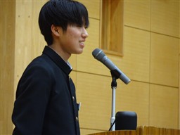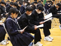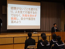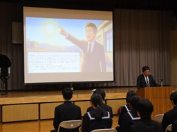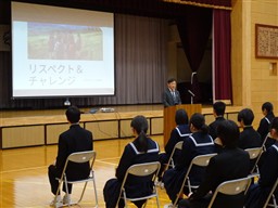 卒業生2名を講師にお招きし、全校道徳を行いました。牧中卒業生の話は、身近であり、今後の進路選択に生かすだけでなく、目標を持ち、希望と勇気をもって困難や失敗を乗り越える態度を身に付けるために毎年有意義な時間となっています。