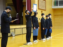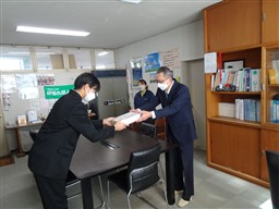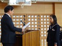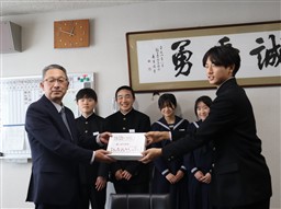 生徒会で行っていた、台風15号に伴う竜巻被害に対する募金が、合計で44,460円となりました。本日、生徒会本部役員が校長室にて、牧之原市教育委員会の方に手渡し、募金を担当する部署に渡していただけるようお願いしました。