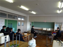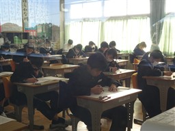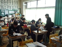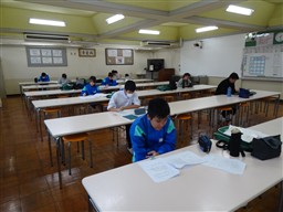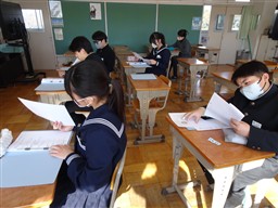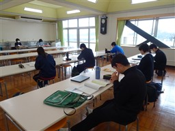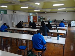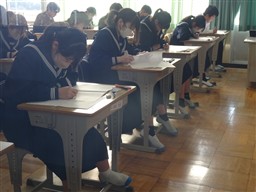 1,2年生の県学力診断調査と3年生の実力テストを行いました。冬休み中も、このテストを目標にしてがんばっていた生徒も多かったので、テスト中の集中力は高く、写真を撮るために教室のドアを開けるのをためらうほどでした。(ガラス越しに撮影しました。)