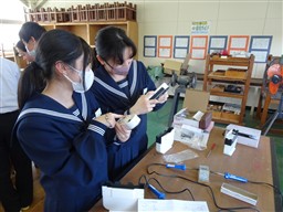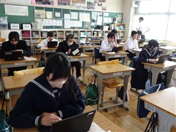 1年生の音楽科では、「魔王」の秘密を探ろうと、クロムブックで曲を聴いたり、友達と話し合ったりしながら、曲の強弱や工程の工夫について学んでいました。