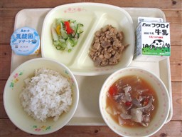 麦ごはん 牛乳 ホイコーロー ポテトサラダ ワンタンスープ  今日の主菜は「ホイコーロー」です。ホイコーローとは、中国の四川料理のひとつで、豚肉と葉にんにくをトウバンジャンで炒めた料理です。日本では、葉にんにくの代わりにキャベツを使うことが多く、味も甘めです。さて、ここで給食クイズです。ホイコーローは漢字で「回す」「鍋」の「肉」と書きますが、なぜ「回す鍋」と書くのでしょうか?①鍋を回しながら作るから。②一度調理した豚肉を鍋に戻して炒めるから。 正解は②です。「回す」には「戻す」という意味があり、本場では、一度ゆでた豚肉を鍋で炒めて作ります。 静岡県の食べ物:牛乳,米,豚肉,鶏肉| 2025/10/02 | |  | by:栄養教諭 |