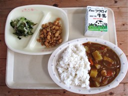 麦ごはん 牛乳 シーフードカレー 大豆としらすの揚げ煮 海藻サラダ  今日の給食はカレーです。ポークカレー、チキンカレー、きのこカレーなど、いろいろな具材との相性がよいカレーですが、みなさんは何カレーが好きですか?今日は、えびとイカが入った魚介のうま味がたっぷりの「シーフードカレー」です。ある調査によると、北海道はシーフードカレーを食べる率が、他の地域よりも4倍も多いそうです。新鮮な海産物が多い北海道ならではの結果に感じますね。みなさんの家のカレーはどのような具材が入りますか?クラスの仲間と話してみてください。 静岡県の食べ物:牛乳,米,豚肉,しらす干し | 2025/10/15 | |  | by:栄養教諭 |