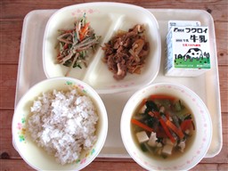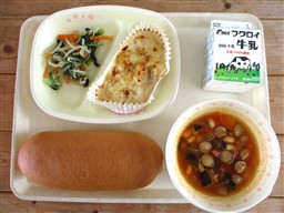 *****食品ロス削減の日にちなんだ献立*****麦ごはん 牛乳 ちくわのごま揚げ おかかあえ 豚肉と大根の炒め煮  今日10月30日は「食品ロス削減の日」です。食品ロスとは、本来食べられるのに捨てられてしまう食品のことです。日本では、毎日ひとり当たりおにぎり1個分の食べものが捨てられています。一方、世界中ではおよそ9人に1人が食べものが足りず、1日に必要な栄養がとれていないそうです。 今日は、給食でも食品ロスを減らすために、豚肉と大根の炒め煮に入っている「大根」と「にんじん」の皮をむくのをやめました。よく見ると、皮がついているのがわかると思います。みなさんが、食品ロスについて知り、考えるきっかけになるとうれしいです。 静岡県の食べ物:牛乳,米,こまつな,かつお節,豚肉 マーガリンパン 牛乳 ツナとポテトのグラタン 野菜炒め ミネストローネ  フランスではじゃがいものことを「大地のりんご」と呼ぶそうです。じゃがいもは、主食にも使われるイモ類で、でんぷんがたっぷりですが、ビタミンCもたくさん含まれています。ビタミンの量は、なんとりんごの約5倍もあります。ビタミンCは熱に弱い栄養素ですが、じゃがいものビタミンCはでんぷんにつつまれているため、熱に強い性質をもっています。そのため効率的にビタミンCをとることができます。今日はグラタンにしました。 静岡県の食べ物:牛乳,小麦,もやし麦ごはん 牛乳 さんまのかば焼き たくあんあえ けんちん汁  秋の魚といえば「さんま」もおいしいですね。秋においしく、刀のように細長いことから、漢字で「秋」の「刀」の「魚」と書いて「秋刀魚」と読みます。秋刀魚には、おもに体をつくるもとになるたんぱく質がたくさん含まれています。EPAやDHAといった体によい油を多く含み、血液をさらさらにしたり、病気を防いでくれたりする働きがあります。また、カルシウムも多く含んでいるため、骨や歯を丈夫にする働きもあります。今日は、旬の秋刀魚をかば焼きにしました。よくかんで食べて、秋の味覚を味わってください。 静岡県の食べ物:牛乳,米,油揚げ,鶏肉,さば節 玄米パン 牛乳 ハンバーグ さつまいもサラダ 野菜とウインナーのスープ  今日は規則正しい生活についてお話します。人間は、光も音も温度もわからない場所で生活をすると、25時間周期で寝起きをするといわれています。しかし1日は24時間です。この時間のずれを調整しているのが、私たちの体の中にある「体内時計」です。体内時計を正常に働かせるためには、朝の決まった時間に太陽の光を浴びる、昼間はなるべく外に出る機会を増やす、友人や家族と一緒に食事や運動、勉強をする、1日3回の食事を規則正しくとるなどが有効といわれています。規則正しい生活で、体内時計をきちんと動かしましょう。 静岡県の食べ物:牛乳,小麦, | 2025/10/24 | |  | by:栄養教諭 |