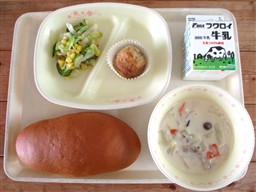 黒糖パン 牛乳 じゃが丸くん キャベツサラダ きのこシチュー  今日のおすすめ料理は、秋の味覚のひとつ「きのこ」を使った「きのこシチュー」です。日本は雨が多く、気温の高い時期もあるので、きのこの生育にはとても適した環境です。そのため、たくさんの種類のきのこがあり、名前がついている物だけでも1,500種類くらいあるそうです。きのこには、骨を強くするのに大切なビタミンDや、おなかの調子を整える食物せんいなどがたくさん含まれています。今日は「えのきたけ」「ぶなしめじ」「エリンギ」の3種類を使いました。 静岡県の食べ物:牛乳,小麦,豚肉