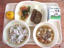 麦ごはん 牛乳 揚げ出し豆腐のそぼろあんかけ れんこんの金平 ごま豆乳汁 今日の汁ものは、豆乳とごまが入った「ごま豆乳汁」です。豆乳は、大豆が原材料の飲み物ですが、どのように作られるのでしょうか。豆乳は、大豆を水にひたして、すりつぶし、水を加えて煮詰めた汁をこして作られます。大豆が原料のため、体をつくるもとになるたんぱく質がたっぷり含まれています。また、豆乳を温めると膜ができます。これは湯葉です。今日は、湯葉ができないように火加減に気をつけて調理しました。今日もしっかり食べて丈夫な体をつくりましょう。 静岡県の食べ物:牛乳,米,鶏肉,豚肉,かつお節,さば節| 2025/10/06 | |  | by:栄養教諭 |