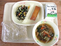 中華めん 牛乳 しょうゆラーメンスープ 春巻き ひじきサラダ  給食クイズです。ひじきは、見た目がある動物のしっぽに似ていることから、漢字で書くと動物の名前が使われています。その動物はなんでしょうか? ➀熊、②鹿、③猫