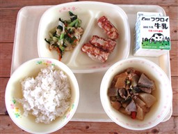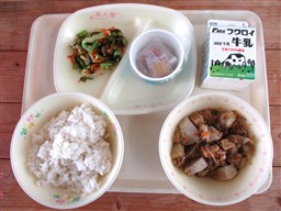 *******日本味めぐり献立「九州地方」******麦ごはん 牛乳 チキン南蛮(タルタルソース) きゅうりの塩こんぶあえ のっぺ汁   <チキン南蛮> <のっぺ汁> 今日は日本味めぐり給食です。「チキン南蛮」は、今から約60年前に宮崎県の洋食店で、まかない料理として作られたのが始まりとされています。当時は、「鶏唐揚げ甘酢漬け」と呼ばれる料理だったようで、その後タルタルソースをかけて食べられるようになったそうです。また、あえものの「きゅうり」は、宮崎県が生産量日本一です。「のっぺ汁」は、全国で作られる郷土料理で、根菜類をたくさん使った汁物のことです。熊本県ではサイコロ状に切ることが多いそうです。 静岡県の食べ物:牛乳,米,かつお節 | 12345次 |