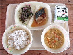 *****牧中で漬けた「梅干し」を使った給食*****麦ごはん 牛乳 さばのみそ煮 赤じそあえ かきたま汁  <さばのみそ煮> みなさんは、「青魚」を知っていますか?青魚というのは、今日の給食に使っている「さば」のほかに、「さんま」や「あじ」などの魚のことで、背中の部分が青い色に見えることからこう呼ばれます。青魚のあぶらには血液をサラサラにし、血管をきれいにしてくれる働きがあります。また、頭の働きをよくする効果もあるといわれています。今日のさばのみそ煮は、牧之原中学校の総合文化部と有志で集まった生徒が漬けた「梅干し」を使って手作りしました。 静岡県の食べ物:牛乳,米,梅,かつお節 | 2025/10/23 | |  | by:栄養教諭 |