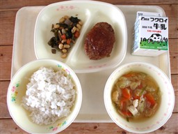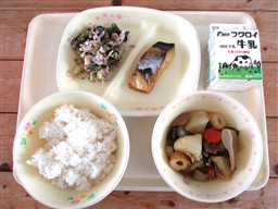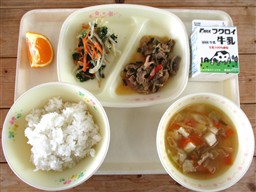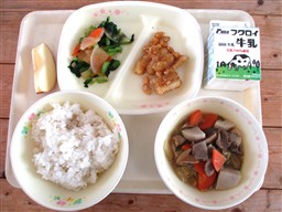 給食には毎日、牛乳がつきます。牛乳には、みなさんの骨や歯を丈夫にする「カルシウム」がたくさん含まれています。成長期のみなさんには、欠かせない栄養素です。寒くなってくると、冷たい牛乳が飲みにくいと感じる人もいるかもしれません。そんな時には、ゆっくりと少しずつ飲んでみましょう。ゆっくり飲むと消化もよく、体にもやさしいです。また、アーモンドあえの小松菜にも、カルシウムが多く含まれています。もりもり食べてほしい食材です。