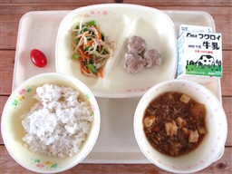 今日の静岡県の食べ物は、「米・牛乳・小松菜・もやし・大根・ねぎ・ミニトマト」です。なかでも、「小松菜・大根・ミニトマト」は牧之原市で作られました。小松菜は、なかだ園芸の中田さんが育ててくれたものです。1年中栽培していて、1年中給食に使っています。今日はサラダに使いました。ミニトマトは、松下農園さんで作られたものです。アイコという品種で、甘みが強く、酸味が控えめな食べごたえのあるミニトマトです。また、牧之原市の特産物である大根は、マーボー大根にしました。地元のめぐみを味わってください。