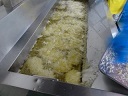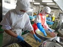 黒はんぺんのお茶フライは、黒はんぺんに小麦粉に粉茶を混ぜて水でといた衣とパン粉をつけて揚げます。一枚一枚、ていねいに衣をつけて揚げました。390枚の黒はんぺんを約30分かけてで衣つけして、カラッと揚げます♪