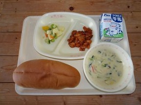 今日は、豚肉と野菜を炒めて、ケチャップで味付けした「トマトポークチャップ」です。ケチャップとソースで味付けするため、甘さと酸味が混ざった味に仕上がっています。パンに切れ目が入っているので、トマトポークチャップをはさんで食べてください。スープは、チンゲンサイがたくさん入ったクリームスープです。チンゲンサイは中国から伝わってきた野菜です。40年ほど前に磐田市で栽培されるようになり、静岡県内に広まりました。今日は、御前崎市でつくられたチンゲンサイを使ってクリームスープを作りました。