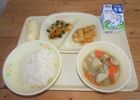 今日は日本味めぐり給食で、東北地方の献立を取り入れました。いも煮は山形県の郷土料理です。大鍋に里いもや野菜を入れて作ります。今日のように豚肉を使ったみそ味のいも煮は日本海側の庄内地方のものです。同じ山形県でも内陸側の地方では、牛肉を使ったしょうゆ味のいも煮を食べるそうです。おみ漬けは、小松菜や大根、にんじんなどの野菜を刻んで塩やしょうゆで味付けした漬け物です。雪国である山形県では、冬に野菜がなかなか採れなかったので、冬の保存食として、いろいろな漬け物が作られてきました。そしてデザートは、日本一の生産量を誇る、青森県のりんごです。