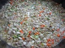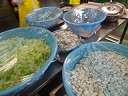 米、いか、大根、小松菜、にんじん、里いも、豚肉、白菜、ごぼう、ねぎ、しめじ、こんにゃく、りんごです。米やいか、豚肉、ごぼう、しめじを除いた約40kgの食材とりんごを機械を使わないで手切りで切りました。たくさんの食材でしたが、調理員さんが料理に合った切り方で、一つ一つていねいに切ることで、おいしいできあがりの料理になりました。