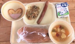 今日のパンには切れ目が入っています。焼きそば入り野菜ソテーをはさんで、焼きそばパンにして食べてください。ソーセージをはさんで、ホットドックでも良いですね。