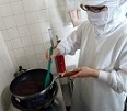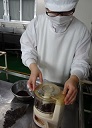 土用干しで干して乾燥した赤じそをミキサーにかけて細かくし、赤じその風味を出すためにフライパンで炒って加熱しました。それをしらすを入れて炊いたご飯に混ぜて、しらすゆかりご飯を作りました。牧中の自然の風味いっぱいのご飯になりました。