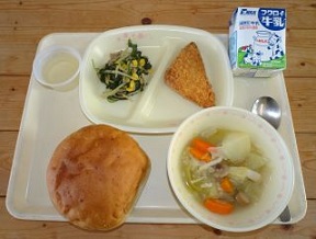 みなさんは、給食の前に手を洗いましたか?だんだん寒くなってきて、水道の水が冷たく感じるようになってきます。食事の前の手洗いがおろそかになっている人はいませんか?手は、いろいろなものに触れるので、目に見えない汚れがたくさんついています。指先を水で濡らしただけの洗い方では、汚れは落ちません。石けんを使って指先や指の間、手の甲などをていねいに洗い、洗い終わったらハンカチで必ず拭くことが大切です。特に、今日などのパンを食べる時は、直接、手で食べ物に触れながら食べるので、食事の前の手洗いは大切です。