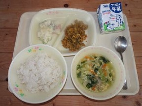 副菜のポテトサラダのじゃがいもは、SSS(スクールサポートスタッフ)の石田さんが牧中の畑で育てたものを使いました。
