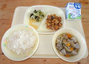 9月18日は「敬老の日」でした。日本は、世界中でも健康で長生きをする国の一つです。その理由は、栄養バランスのよい日本食にあるといわれています。栄養バランスのよい食事の覚え方に、「まごは(わ)やさしい」という言葉があります。これは、栄養バランスのよい食事に取り入れたい食材の頭文字を語呂合わせにしたものです。豆類の「ま」、ごまの「ご」、わかめの「わ」、野菜の「や」、魚の「さ」、しいたけの「し」、いも類の「い」です。この7種類の食材を少しずつ食事に取り入れることで、自然に健康的な食生活を送ることができるといわれています。今日の給食にも、7品目を取り入れました。
