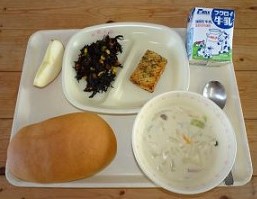 今日のデザートは、今が旬のりんごです。ヨーロッパやアメリカでは「1日1個のりんごは医者を遠ざける」ということわざがあるほど、身体によい食べ物だといわれています。りんごは、今から4,000年ほど前から作られていた果物で、「白雪姫」や「三匹のこぶた」など、昔の物語にも登場します。食物繊維やカルシウムが多く含まれ、おなかの調子を整えたり、身体の中の余分な塩分を外に出したりする働きがあります。りんごの品種もたくさんあるので、食べ比べをして味の違いを楽しむのも、旬ならではの楽しみ方です。