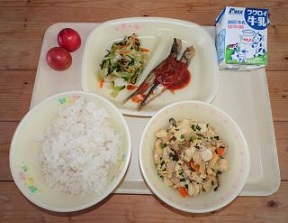 みなさんはししゃもが好きですか?ししゃもは頭からしっぽまで丸ごと食べることができるため、ししゃもの持つ栄養素を余すことなく食べることができます。特に、カルシウムが豊富に含まれていて、骨や歯を丈夫にするはたらきがあります。また、イライラを押さえる効果もあるといわれています。今日は、ししゃもにトマトを使ったソースをかけてみました。給食では南蛮漬けの味つけが多く登場するししゃもですが、トマトソースの味はいかがでしょうか。 ***牧中 恵みの給食***