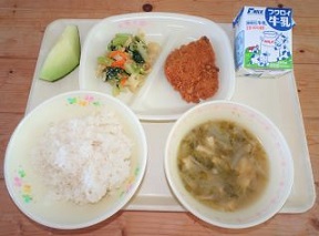 今日の給食に使われている静岡県でとれた食べものは、牛乳、米、かつお、小松菜、あおさ、玉ねぎ、じゃがいも、かつお節、さば節、メロンです。今日のみそ汁には、浜名湖でとれた「あおさ」を使っています。「あおさ」は、わかめや昆布と同じ仲間で、「のり」の一種です。浜名湖でとれた「あおさ」は、鮮やかな緑色と磯の香りが特徴です。ぜひ、見た目や香りを楽しんで下さい。また、デザートのメロンも、浜松市の隣町の「湖西市」で作られたメロンです。