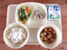 マーボー豆腐は、四川料理のひとつです。本場のものは、唐辛子や花山椒などを入れ、しびれるような辛さを楽しむ料理です。しかし、給食では使用せず、辛さについては、トウバンジャンの量で調節しています。トウバンジャンとは、中国発祥の発酵調味料で、塩辛さと少し酸味のある独特な香りが特徴的な調味料です。炒めると香りがひきたつため、先に炒めてからマーボー豆腐を作ります。香りにも注目しながら食べてください。