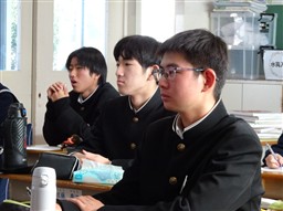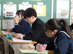 入試に向けて、食の面からも学力アップを考えるために、栄養教諭による食の指導をおこないました。間食や夜食の摂り方、栄養バランスについて自分の生活を振り返りながら学習しました。