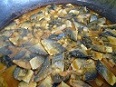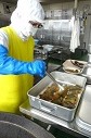 ***給食室の様子*** 今日のは、今年漬けた梅干しを使って、給食室手づくりの”さばのみそ煮”でした。種をとった梅干しと、みそ、根深ねぎ、おろし生姜、さとう、酒、しょうゆの煮汁をつくり、鯖を加えて1時間近くコトコト煮込んでつくりました。味が染みて、おいしく煮ることができました♪