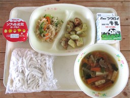 今日は、だしをきかせた「肉うどん」です。「だし」とは、魚介や野菜などを水と一緒に煮て、「食材に含まれているうま味を水の中に取り出した汁」のことをいいます。料理にだしを使うことで、食材のおいしさを引き出し、塩分が少なくてもおいしい料理となります。そのため、日本人が摂りすぎといわれている塩分を控えることができ、からだにも優しいです。今日はかつお節を使ってだしをとり、具材の豚肉からもうま味がたくさん出たうどんつゆになりました。だしのおいしさを感じてください。