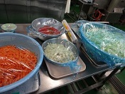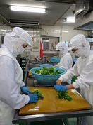 ☆給食をつくっている様子☆ 今日の給食は10種類、35kgの野菜を使ってつくりました。スライサーなどの機械を使わずに、半月切りやみじん切り、短冊切り、いちょう切りなど、料理に合わせた形に切って調理しました。