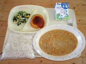 今日はソフトめんです。ソフトめんは、今から50年くらい前、給食の主食のほとんどがパンだった頃に、主食の種類を増やすために取り入れられたのが始まりです。そこから全国に広がりました。ソフトめんのソースに、ミートソースやナポリタンソースがよく登場しますが、全国では様々なソースがあるそうです。今日は、ひき肉と細かく切った野菜を炒めて、みそなどの調味料で味付けした「肉みそソース」にしました。初めて給食の献立に登場するソースです。
