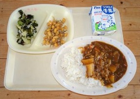 大豆は、漢字で「大きな豆」と書きます。名前の由来は、「大いなる豆」で、立派な豆という意味からきているそうです。大豆は「畑の肉」ともいわれ、血液や筋肉など、からだをつくるもとになるたんぱく質をたくさん含んでいます。これからせいちょうしていくみなさんにとって、必要な栄養素です。今日は、この大豆と骨や歯を丈夫にするカルシウムがたくさん含まれている「しらす」を使った「大豆としらすの揚げ煮」の献立です。よくかんで食べてください。