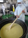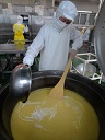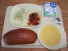 ***給食室の様子*** 今日の豆乳入りポタージュは、20分以上かけて玉ねぎのみじん切りをゆっくり炒めて、玉ねぎの甘みを引き出しました。そして、コーンペーストや豆乳や牛乳、調味料を加えて、時間の許す限り、ゆっくり・じっくりと煮込んで作りました。曇り空の肌寒い一日だったので、身体の中から温まるポタージュが出来あがりました♪