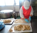 鶏ひき肉と卵、ねぎ、生姜、パン粉、みそ、さとう、しょうゆを混ぜてオーブンで焼きました。生地をこねる時、鶏肉がとても冷たいので、冷たさで手が痛くなってしまいますが、おいしい松風焼きにするためには、この作業がとても大切になってきます。ていねいに混ぜ合わせて生地を作り焼きました。食材が十分に混ざり合い、調和のとれた味と柔らかさのある松風焼きができました。