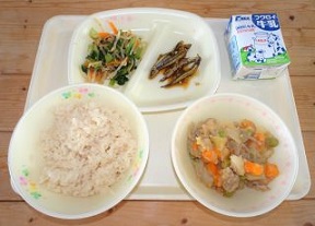 今日の主菜は、きびなごの南蛮漬けです。きびなごは、体の大きさが10㎝くらいの小さな魚で、体の真ん中に幅拾い銀色の帯のような縦縞模様があります。きびなごは鹿児島県で多く獲れます。鹿児島では、「帯」のことを「きび」ということから、「帯の魚の子」という意味で「きびなご」という名前がついたという説があります。頭から骨まで丸ごと食べる事ができるため、カルシウムがたくさんとれます。成長期のみなさんにとって、残さず食べてほしい一品です。魚が苦手な人も、一口はチャレンジしてみてくださいね。