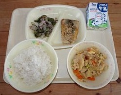 近畿地方の和歌山県の料理を給食に取り入れました。和歌山県にある高野山には、お寺がたくさんあります。お寺で修行するお坊さんは、野菜や豆などの植物性の食材だけを使って作る「精進料理」を食べます。その食材の一つが、豆腐を乾燥させ、さらにそれを凍らせて作る「高野豆腐」です。高野豆腐は、和歌山県の高野山でうまれて、お坊さんたちが全国に広めたといわれています。また、今日の主菜は、和歌山県でもたくさん獲れる”秋の味覚”のさんまを蒲焼きにしました。