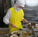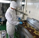 ☆給食を作っている様子☆ 秋の味覚である『さんま』を蒲焼きにしました。さんまを開いて唐揚げにしたものに、手作りの蒲焼きのタレをかけて作りました。さんまが中心まで加熱できているかどうか、温度を計って確認します。