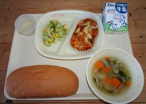 今日のスープには、ラビオリが入っています。ラビオリは、イタリア料理の「パスタ」の一種です。パスタとは、小麦粉と水を練り合わせて作った食品のことで、スパゲッティやマカロニなどもパスタの仲間です。ラビオリはパスタの中に、ひき肉やみじん切りにした野菜などが入っているのが特徴です。今日のラビオリには、ひき肉と玉ねぎが入っていますが、ホウレン草やじゃがいも、チーズが入ったラビオリもあるそうです。また、中華料理には、ラビオリと似た食べ物にワンタンがあります。世界の国によって、様々な食べ物がありますね。