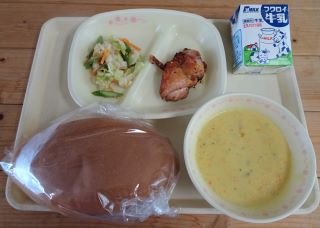 今日のスープは、とうもろこしがたっぷり入ったコーンポタージュです。