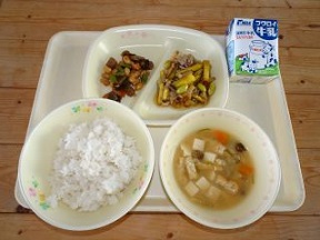 今日の主菜は『カレイの豊年あんかけ』という料理です。この料理は、和食の料理人さんが給食用に考えてくれた料理です。「豊年」とは、作物がたくさんとれることをいいます。日本では、お米がとれる秋に豊年を感謝する祭りが行われたりします。豊年あんかけの「あん」には、秋にとれるあつまいもやきのこが入っています。また、カレイは、秋から冬にかけておいしい魚です。季節の食べ物に感謝して、味わって食べるのは、和食のよいところの一つです。