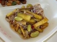 ☆給食の様子☆ カレイの豊年あんかけの「あん」は、素揚げした拍子切りのさつまいもとえのきたけ、枝豆を使って、稲穂をイメージしたあんかけになっています。