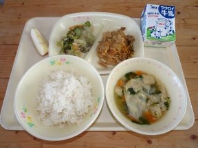 食事は、主食とおかずを交互に食べることによって、どちらもおいしく味わうことができます。ご飯の味は、さっぱりとした淡泊な味なので、おかずと一緒に味わうことで、味覚を鍛えることができます。また、主食とおかずを交互に食べることで、同時に食べ終わることができます。さらにおいしく食べるもう一つのコツは、よくかんで食べることです。食べものをよくかむことで、料理の味をしっかり味わうことができます。今日の給食も、ご飯とおかずを交互によくかんで食べ、最後にりんごを食べて口の中をさっぱりさせると、おいしく食事ができたという満足感につながります。