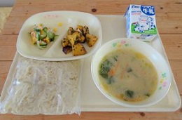 寒い時期に温かいラーメンは、とてもおいしく感じますね。ラーメンは明治時代、横浜の中華街のめん料理が始まりといわれています。今から110年ほど前に東京の浅草の「来々軒」という中華料理のお店で初めて出されて、多い日には1日で3,000杯も出るほど人気メニューになったそうです。今日のラーメンスープは、とんこつ味のスープで、人参やキャベツ、チンゲン菜やねぎなどの野菜がたっぷり入った具だくさんのスープになっています。ラーメンスープには、しょうゆやみそ、塩、とんこつなど、いろいろな味があります。みなさんは、どの味が好きですか?
