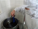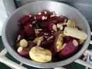 <20kgのサツマイモを乱切りに切ります> <別鍋で蜜を作りました>